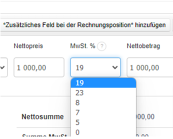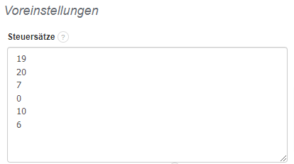 Der Hauptsteuersatz und der Steuername können im Menü Einstellungen> Kontoeinstellungen> Konfiguration> Standardsteuer (%) und Steuerart definiert werden.