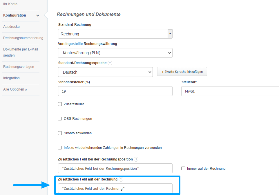 - Gehen Sie zur Registerkarte Konfiguration> Rechnungen und Dokumente,